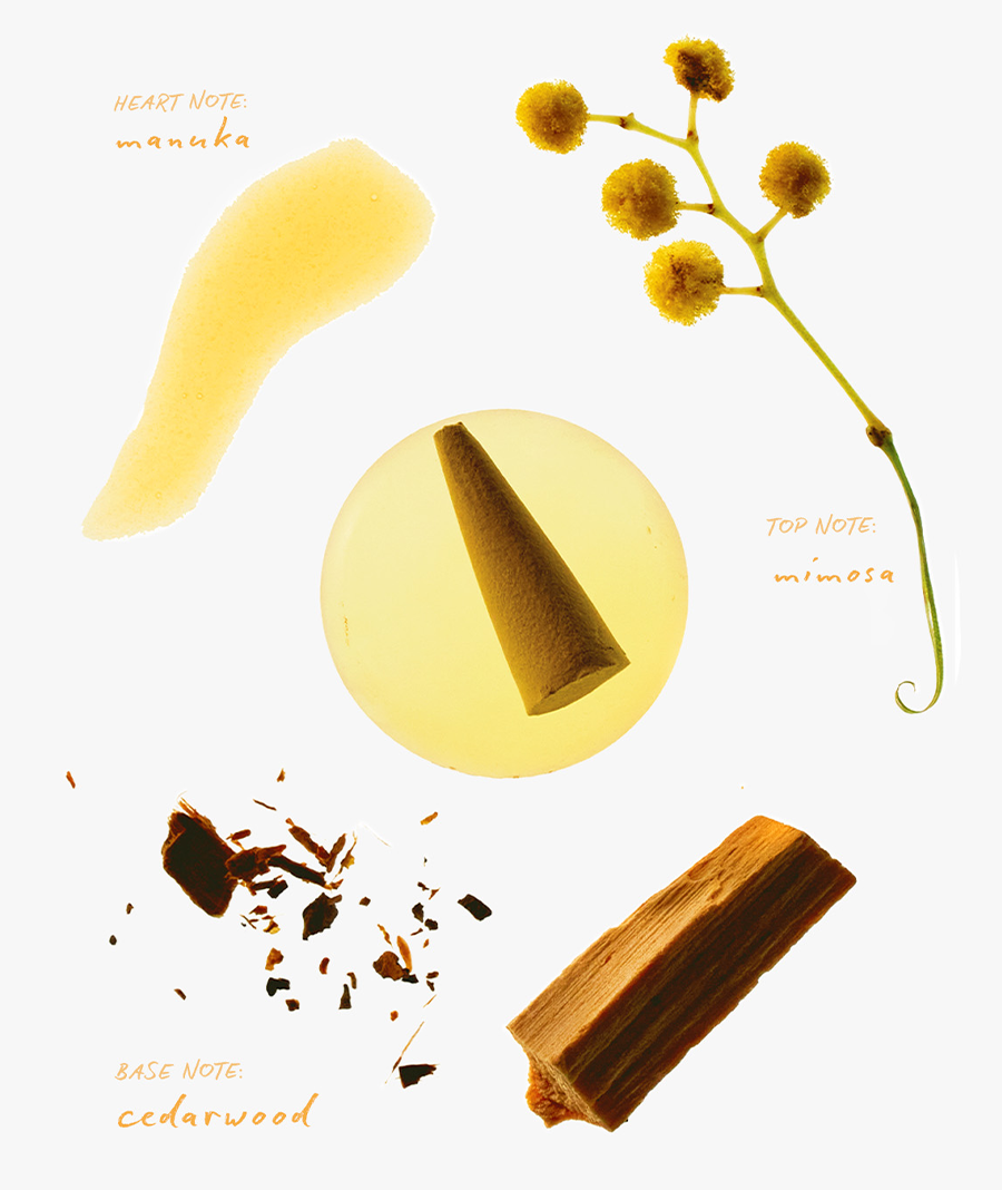 The scent of mimosa, combined with manuka & cedarwood will brighten up your space and add a warm glow to your space. A perfect balance of earthy freshness with a floral touch for your day to day.