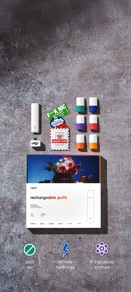 Ripple+ is a nicotine-free portable aromatherapy diffuser, delivering the benefits of natural botanical blends. From our rechargeable device giving you endless hours of plant-powered goodness, to our single-use formulas, our diffusers are a gateway to a plant-powered utopia.