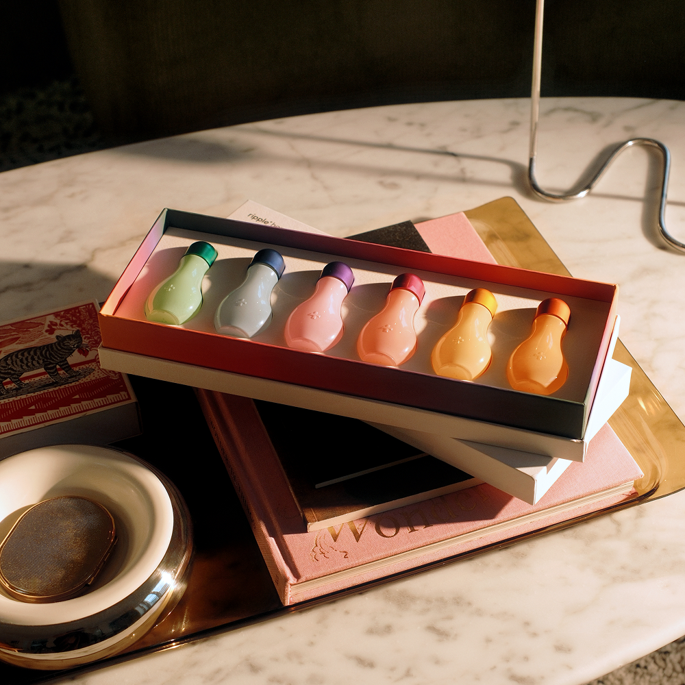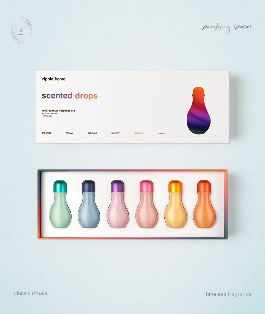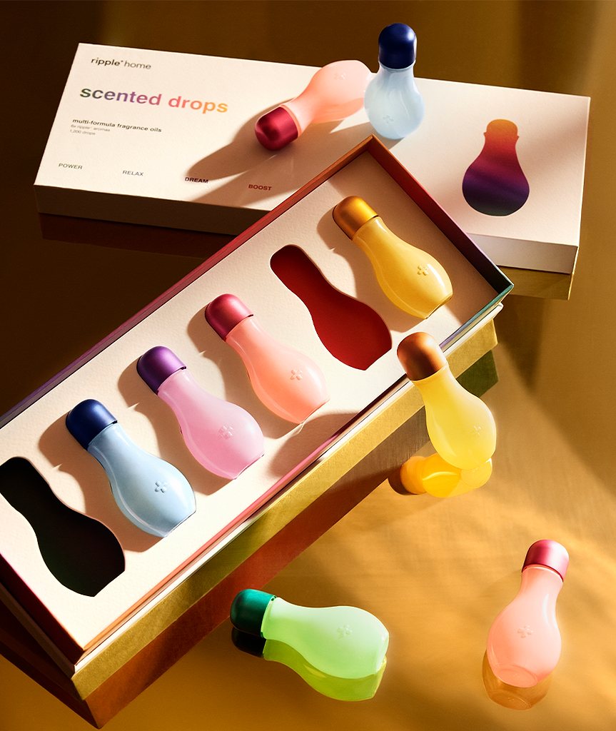 Our ripple⁺ scented drops are bespoke fragrance oil blends crafted to transform your space through scent and atmosphere. Explore our full set, and embark on a journey where each aroma carries it's own distinct character and story. Each set contains 6x ripple aromas (200 drops per bottle, 1,200 drops per set) and together with our scent burner, these drops of love with create a refined energy, elevating your home with layers of scent, design and purity.